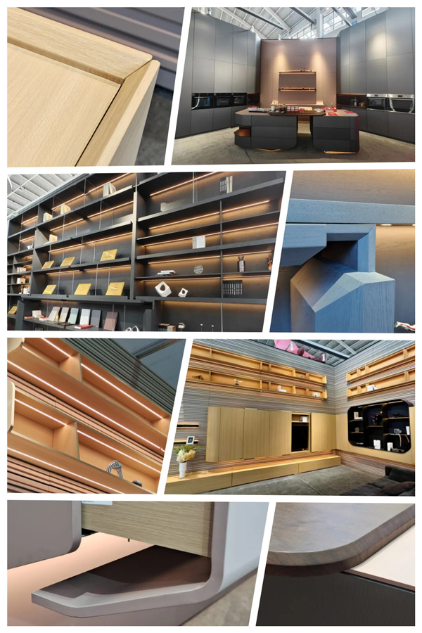 鋼琴格柵、45度斜邊收口、“三明治”板材工藝及非規(guī)則圓弧設(shè)計(jì)……多元美學(xué)融合,呈現(xiàn)全新家居意境。應(yīng)用上,ENF級(jí)環(huán)保,4.5米通頂家居,第三代顆粒板、碳晶飾面板……為與會(huì)觀眾帶來高顏值、高個(gè)性化、高品質(zhì)的整家美學(xué)方案。