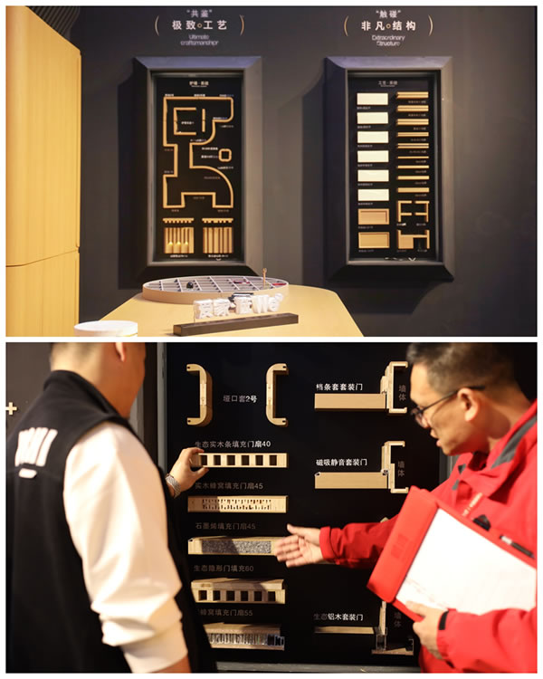 作為此次展會的"現(xiàn)象級"展品,鵬鴻工法墻以模塊化系統(tǒng)思維,通過"解構(gòu)式"陳列,將工藝系統(tǒng)、木門系統(tǒng)與護墻系統(tǒng)整合,58個工藝模塊覆蓋結(jié)構(gòu)、裝飾與功能三大維度,清晰呈現(xiàn)全屋定制的工藝系統(tǒng)。
