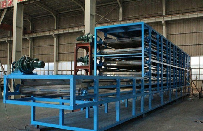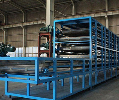 將物料均勻的平鋪在網(wǎng)帶上,網(wǎng)帶采用12-60目的鋼絲網(wǎng)帶,由傳動裝置拖動在干燥機內(nèi)往返移動,熱風(fēng)在物料間穿流而過,水蒸氣從排濕孔中排出,從而達到干燥的目的,箱體長度由標(biāo)準(zhǔn)段組合而成,為了節(jié)約烘干場地,可將烘干機制成多層式,常見的有二室三層、二室五層、長度6-80m,有效寬度0.6-3.0m。