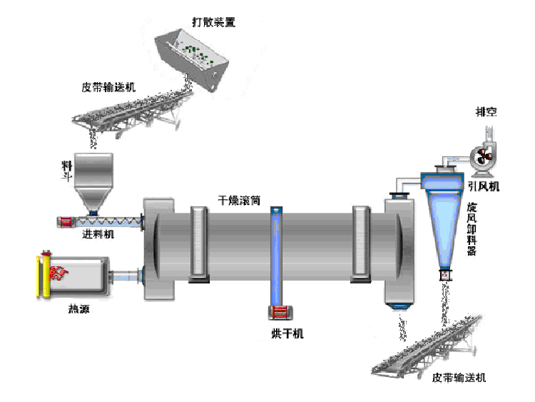 干燥的濕物料由皮帶輸送機或斗式提升機送到料斗,然后經(jīng)料斗的加料機通過加料管道進入加料端。加料管道的斜度要大于物料的自然傾角,以便物料順利流入干燥器內(nèi)。干燥器圓筒是一個與水平線略成傾斜的旋轉(zhuǎn)圓筒。物料從較高一端加入,載熱體由低端進入,與物料成逆流接觸,也有載熱體和物料一起并流進入筒體的。隨著圓筒的轉(zhuǎn)動物料受重力作用運行到較底的一端。濕物料在筒體內(nèi)向前移動過程中,直接或間接得到了載熱體的給熱,使?jié)裎锪系靡愿稍?,然后在出料端?jīng)皮帶機或螺旋輸送機送出。在筒體內(nèi)壁上裝有抄板,它的作用是把物料抄起來又撒下,使物料與氣流的接觸表面增大,以提高干燥速率并促進物料前進。載熱體一般分為熱空氣、煙道氣等。載熱體經(jīng)干燥器以后,一般需要旋風除塵器將氣體內(nèi)所帶物料捕集下來。如需進一步減少尾氣含塵量,還應(yīng)經(jīng)過袋式除塵器或濕法除塵器后再放排放。